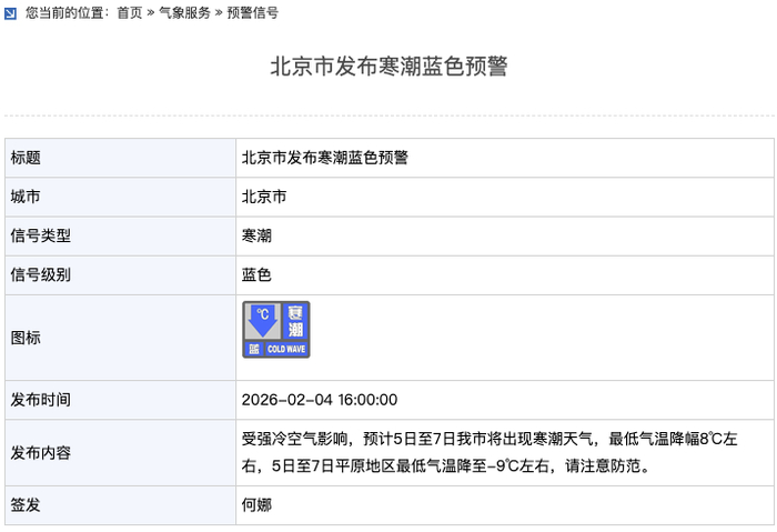 受強(qiáng)冷空氣影響,預(yù)計(jì)5日至7日北京市將出現(xiàn)寒潮天氣,最低氣溫降幅8℃左右,5日至7日平原地區(qū)最低氣溫降至-9℃左右,請注意防范。