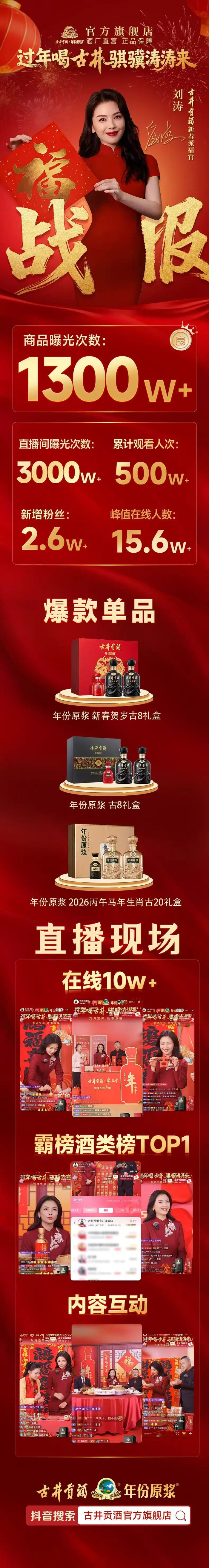 日前,古井貢酒正式官宣演員劉濤擔(dān)任“新春派福官”引起廣泛關(guān)注。隨后,劉濤的身影頻繁出現(xiàn)在總臺(tái)春晚彩排、粵港澳大灣區(qū)春晚的錄制現(xiàn)場(chǎng),更在堪稱“云上春晚”的直播中創(chuàng)下超500萬(wàn)人次觀看、商品曝光破1300萬(wàn)、霸榜酒類榜榜首的亮眼成績(jī)。
