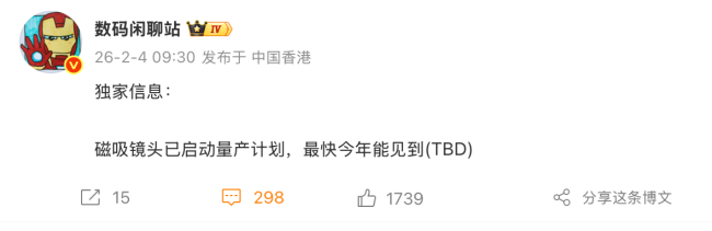 【iMobile愛科技資訊】2月4日消息,手機(jī)影像的物理極限正被模塊化設(shè)計打破。據(jù)博主@數(shù)碼閑聊站 爆料,小米磁吸鏡頭項目已正式啟動量產(chǎn)計劃,最快有望在2026年內(nèi)亮相。該方案的核心在于通過磁吸方式在手機(jī)背部掛載外部光學(xué)鏡組,以提升特定焦段下的成像表現(xiàn)。